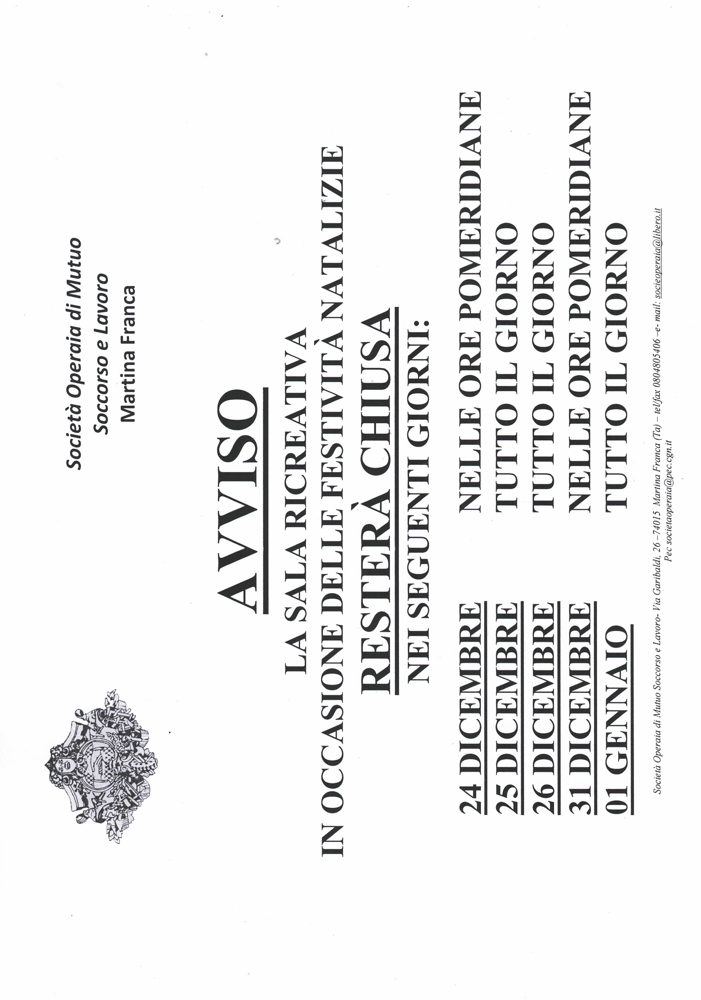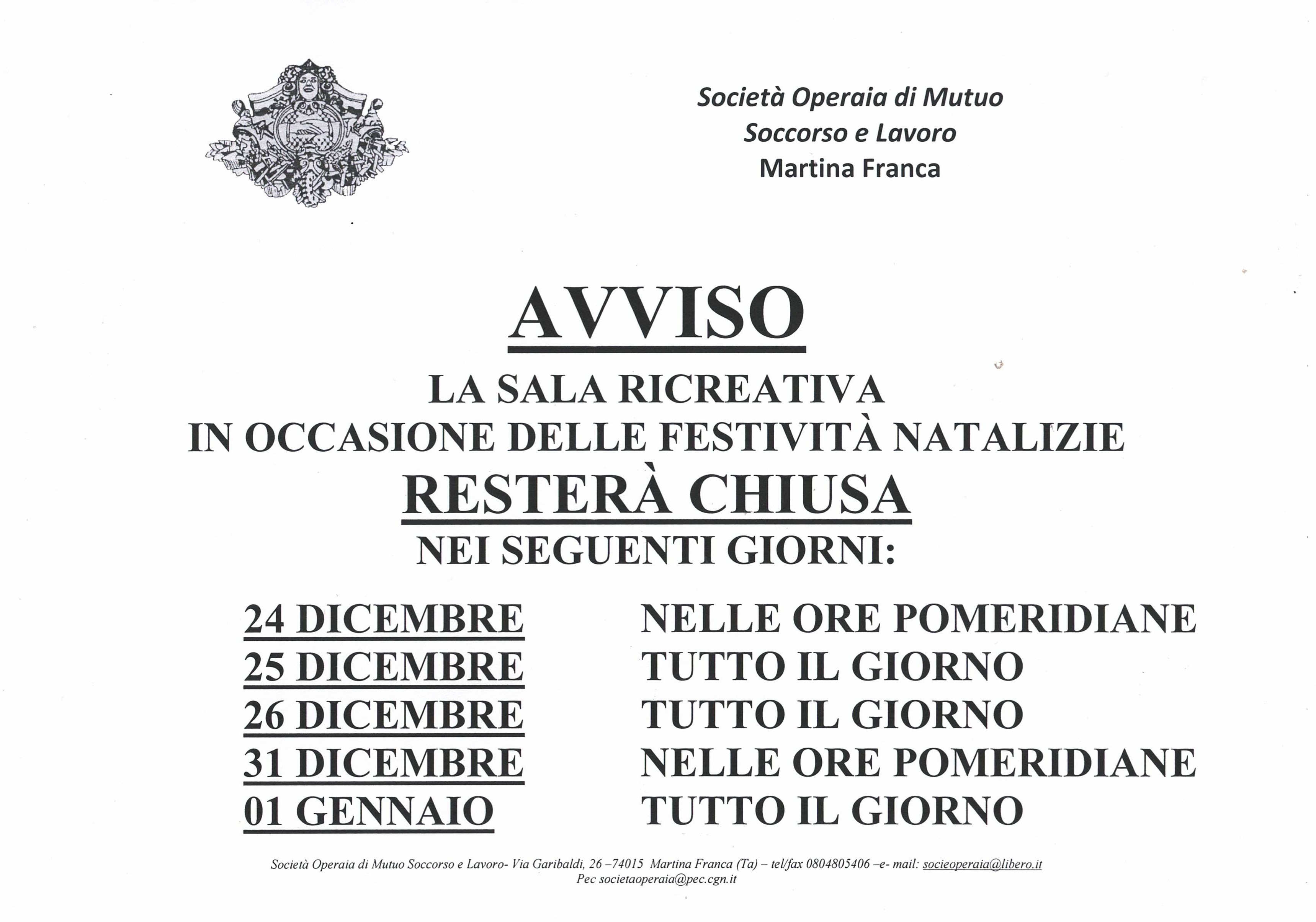 ORARI SALA RICREATIVA FESTIVITA’ NATALIZIE